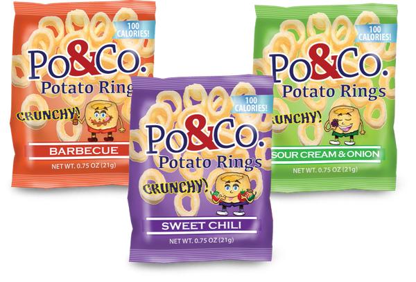 Po & Co. Potato Rings come in 5 tasty flavors - just 100 calories per bag.